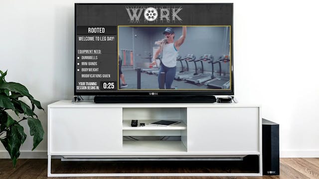 Legs and Glutes. Strength and plyometrics pair up for a lower body blast. Dumbbells and mini bands preferred, bodyweight substitutions given when possible.